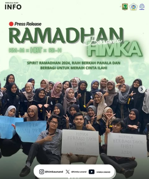 Ramadhan Bersama HIMKA merupakan program kerja gabungan dari Divisi Kerohanian dan Divisi Sosial. Kegiatan ini dilaksanakan pada Sabtu, 30 Maret 2024 dengan mengusung tema “Spirit Ramadhan 2024, Raih Berkah Pahala dan Berbagi untuk Meraih Cinta Ilahi.” Rangkaian acara diawali dengan Kajian Muda-Mudi (KM-M) yang diselenggarakan di Masjid Baitul Ilmi FMIPA Unand. Setelah itu, dilanjutkan dengan HIMKA Berbagi Takjil (HBT) berupa pembagian makanan berbuka puasa kepada masyarakat di sekitar Limau Manis hingga Jalan Bypass. Kegiatan kemudian ditutup dengan Buka Bersama di Masjid Baitul Ilmi sebagai wujud mempererat ukhuwah dan kebersamaan di bulan suci Ramadhan.