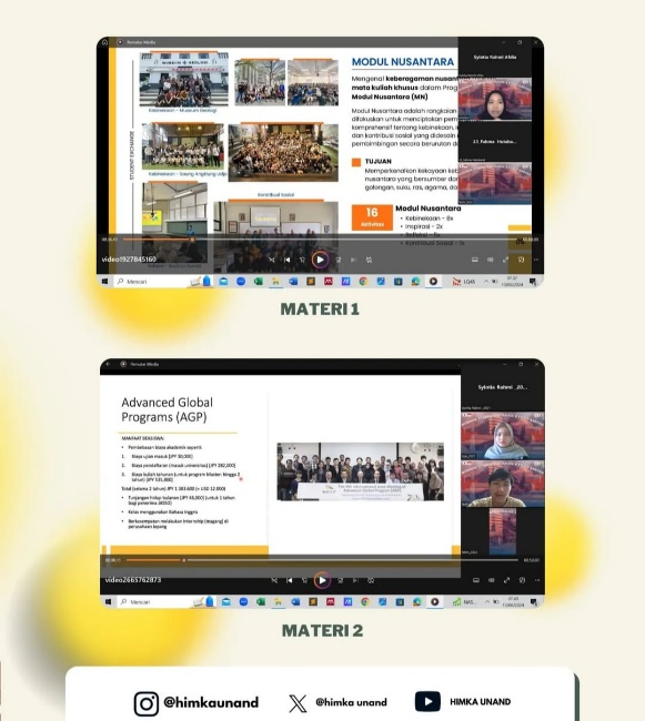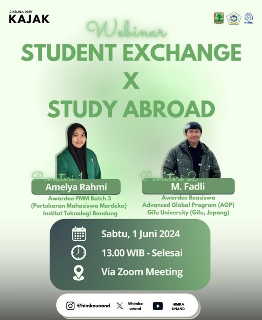 Webinar Student Exchange & Study Abroad merupakan program kerja Divisi Kajian Akademik (KAJAK) yang bertujuan untuk memberikan informasi serta meningkatkan motivasi mahasiswa kimia dalam mengikuti program student exchange dan study abroad. Kegiatan ini dilaksanakan pada Sabtu, 1 Juni 2024 melalui Zoom Meeting dengan menghadirkan dua pemateri: